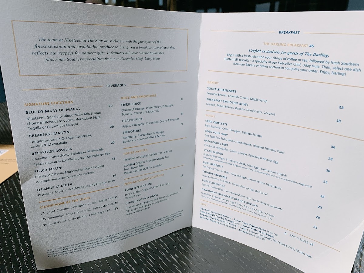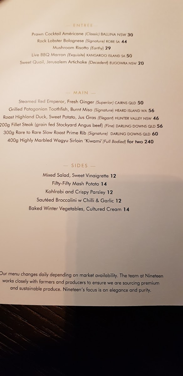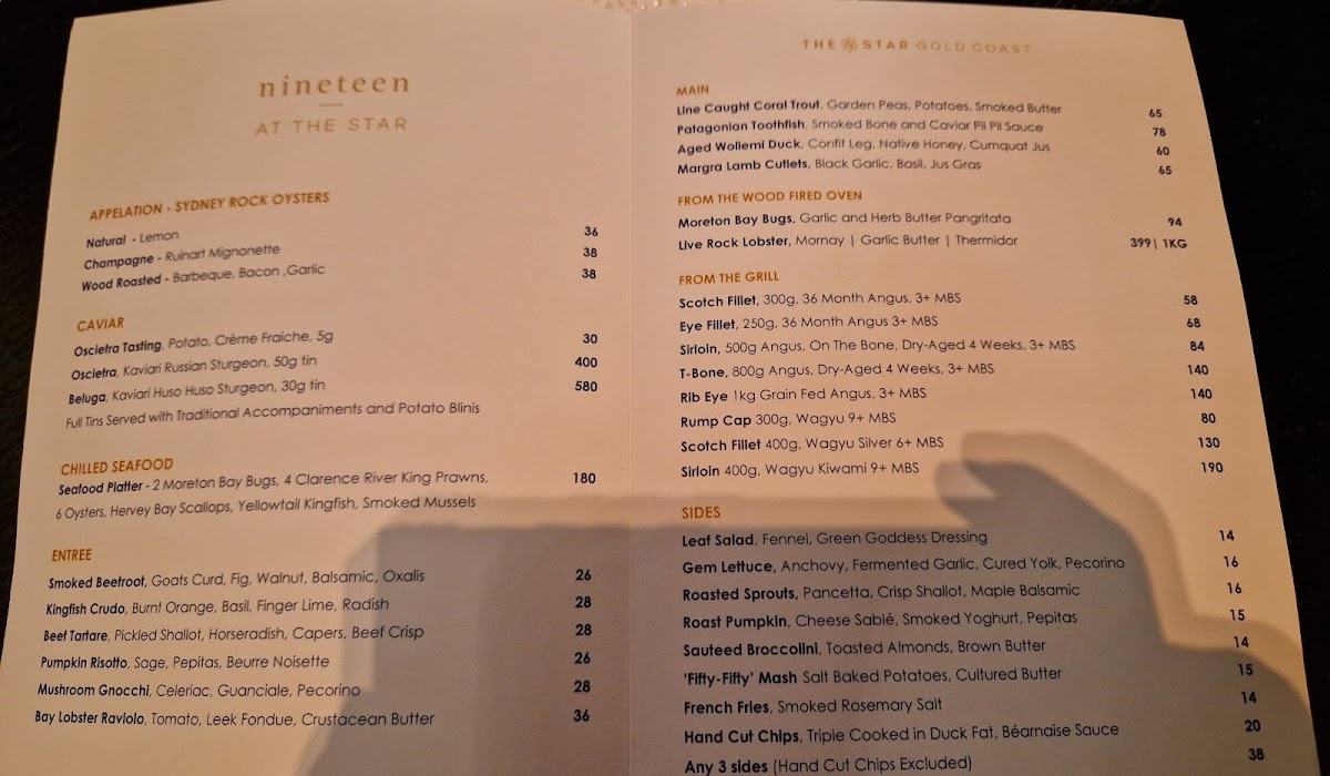 Nineteen at The Star offers a refined bar and grill experience situated high above the Gold Coast on Level 19 of The Darling. The menu masterfully blends luxurious ingredients with classic techniques, delivering dishes that are both elegant and full of vibrant flavors. The starters shine with options like the Rock Lobster Bolognese and Crustacean Risotto, showcasing fresh seafood crafted to perfection. For those seeking indulgence, the caviar selection—from Siberian Oscietra to Beluga—raises the dining experience to an opulent level.